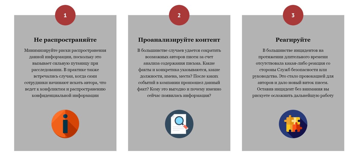 Проанализировали все кейсы, где фигурировали анонимные письма и обращения. Также получили данные от наших партнеров и клиентов, что позволило собрать большую базу инцидентов и их особенностей.